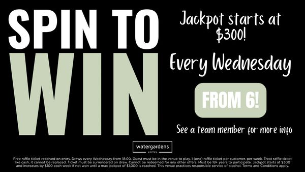 Every Wednesday from 6pm, come on down to Watergardens Hotel for your chance to win cash! Jackpot start at $300 and increases by $100 each week until won! Are you our lucky winner?